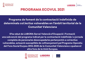 PROMOMART XXI, SL ha rebut de LABORA Servei Valencià d'Ocupació i Formació una subvenció del programa indicat per la contractació indefinida i a jornada completa de persona/es desocupada/es pertanyent/s a col.lectius vulnerables (L.L.L con DNI 18**51**S), actuació susceptible de cofinançament pel Programa Operatiudel Fons Social Eurpeu 2014-2020 de la Comunitat Valenciana o qualsevol altre fons de la Unió Europea. Importe 23.940 euros.